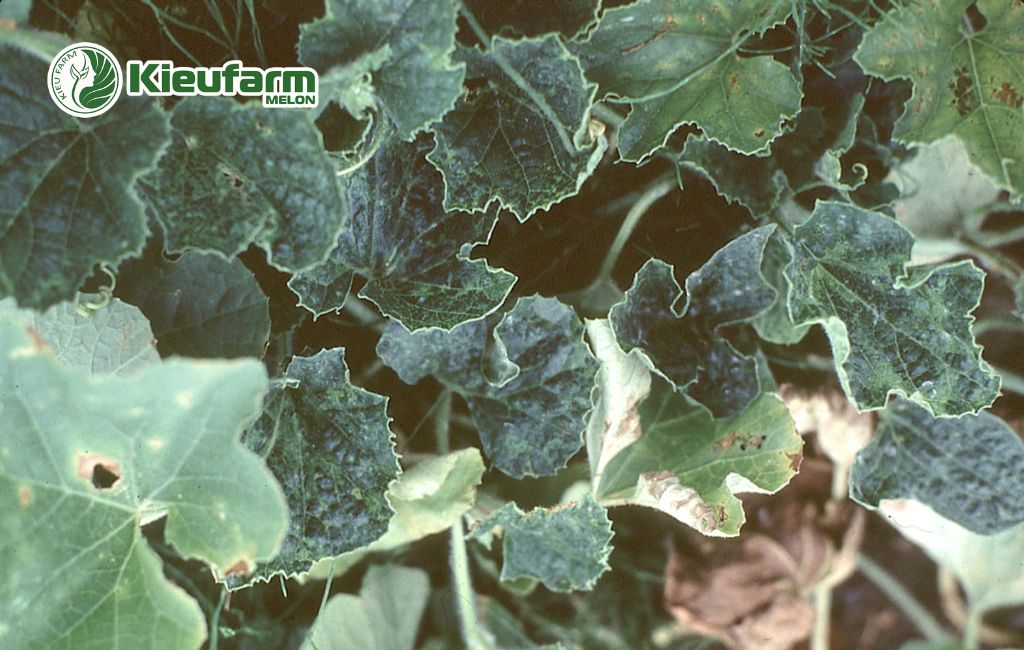 Bệnh khảm lá (Cucumber mosaic virus – CMV) là một bệnh do virus gây ra, khiến cây dưa lưới phát triển kém, lá biến dạng, xuất hiện các vết khảm xanh – vàng, ảnh hưởng nghiêm trọng đến năng suất và chất lượng trái.