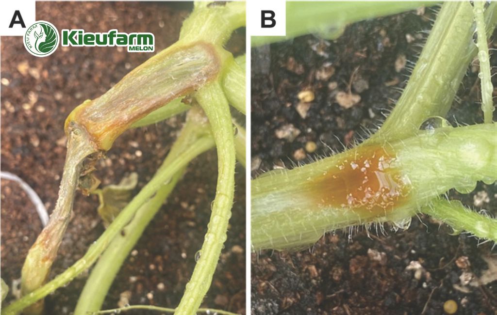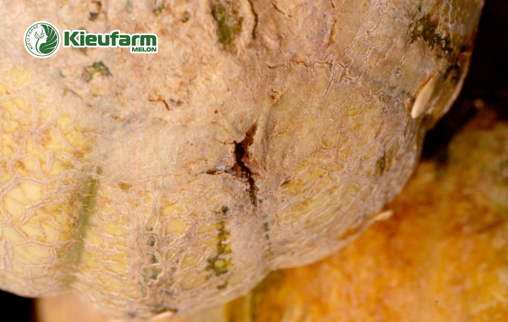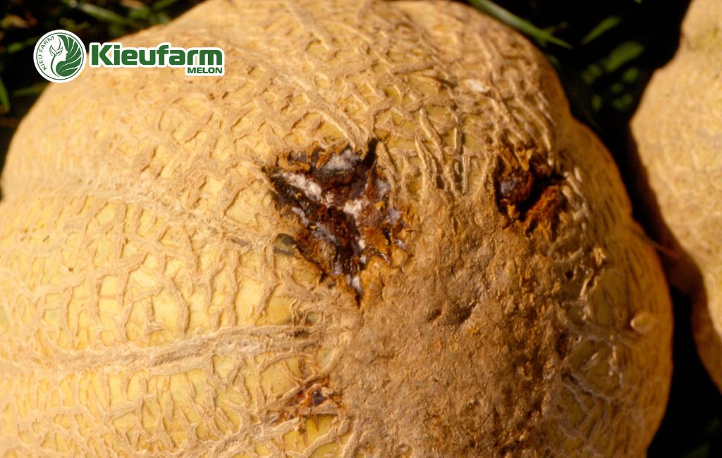 - Trên quả: Trái dưa lưới có vết thối nhũn, ban đầu là các đốm nhỏ, mềm, sau đó lan nhanh khiến vỏ quả nhăn nheo, bề mặt nhớt nước, có thể rỉ dịch và bốc mùi khó chịu. Trong môi trường ẩm cao, vết bệnh có thể bị phủ một lớp nhớt trắng hoặc xám do vi khuẩn phát triển mạnh.