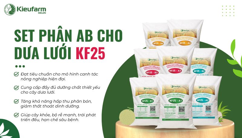 Trồng và chăm sóc dưa lưới KF25 giờ không còn khó! Vì đã có SET Phân tổng hợp AB được Kieufarm nghiên cứu và kết hợp ứng dụng dành riêng cho giống dưa lưới KF25, dễ dàng sử dụng quản lý và chăm sóc, phù hợp với từng giai đoạn của cây, giúp cây khỏe, rễ mạnh, trái ngọt, năng suất cao. Set Phân AB KF25 giúp cung cấp đầy đủ dinh dưỡng, phù hợp cho hệ thống tưới nhỏ giọt, tiết kiệm công mà hiệu quả cực cao!