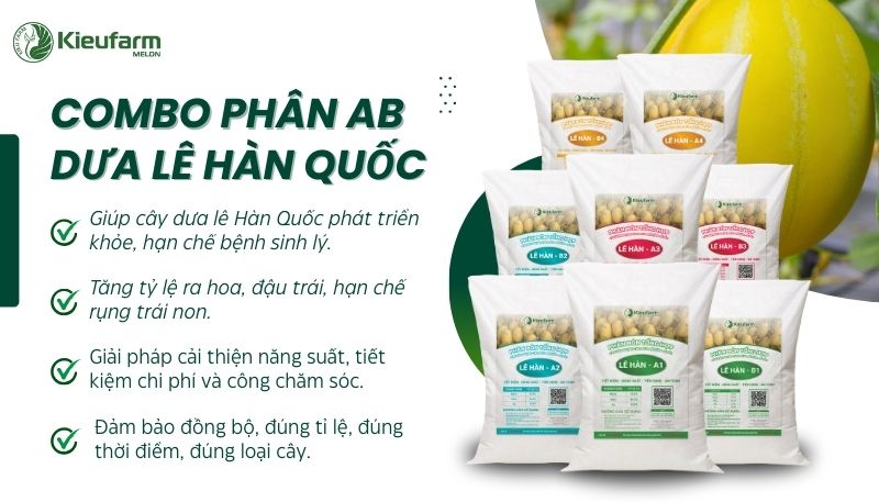 Combo Phân AB Dưa lê Hàn Quốc từ Kieufarm được nghiên cứu riêng, cung cấp đầy đủ NPK, Canxi, Magie theo nhu cầu của cây, giúp cây khỏe mạnh, trái đẹp và ngọt chuẩn.