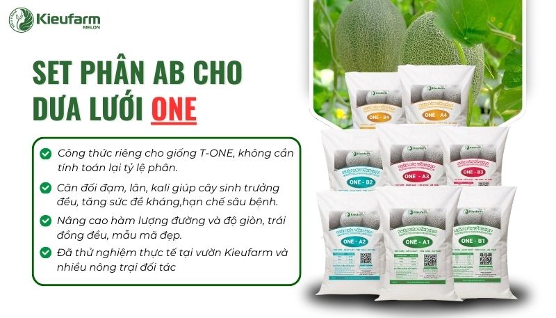 Nhận thấy điều đó, nhằm tối ưu thời gian và công sức cho bà con. Đội ngũ Kỹ sư nông nghiệp Kieufarm đã nghiên cứu quá trình sinh trưởng của giống ONE và phát triển thành công Combo phân bón AB chuyên biệt cho giống ONE, giúp cân bằng dinh dưỡng, kích thích sự phát triển toàn diện từ rễ tới trái, phù hợp từng giai đoạn của cây, gia tăng năng suất và mùa vụ đạt hiệu quả vượt trội.