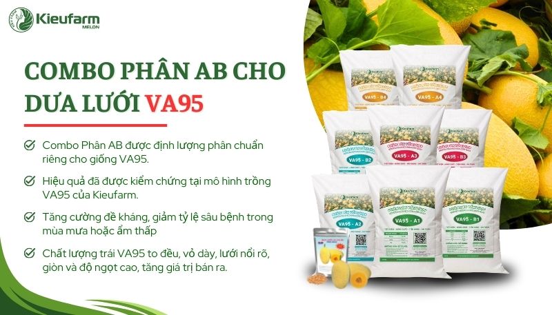 Vì vậy, Kieufarm đã nghiên cứu, phát triển và cho ra Combo Phân AB cho VA95, với công thức hàm lượng cân đối phù hợp với đặc tính của giống, hỗ trợ phát triển từ rễ tới trái, giúp cây khỏe, trái đẹp, cho ra năng suất cao, thu hoạch đúng chuẩn thương phẩm.