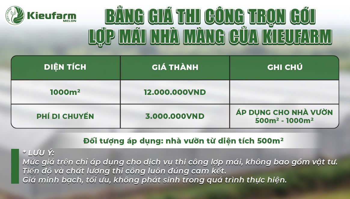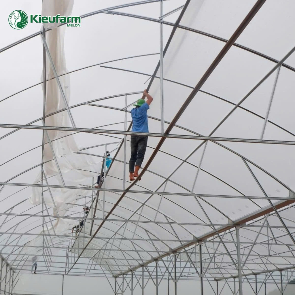 Dịch vụ thi công lợp mái nhà màng của Kieufarm là gói thi công trọn gói bao gồm toàn bộ chi phí nhân công và vận chuyển, sử dụng vật tư màng PE chính hãng Đức Thịnh. Với kinh nghiệm triển khai hàng trăm công trình nhà màng từ Bắc đến Nam, đội ngũ Kieufarm hiểu rõ từng yếu tố kỹ thuật ảnh hưởng đến tuổi thọ mái và chất lượng canh tác, từ đó xây dựng quy trình thi công tối ưu, tiết kiệm thời gian và chi phí cho chủ đầu tư.