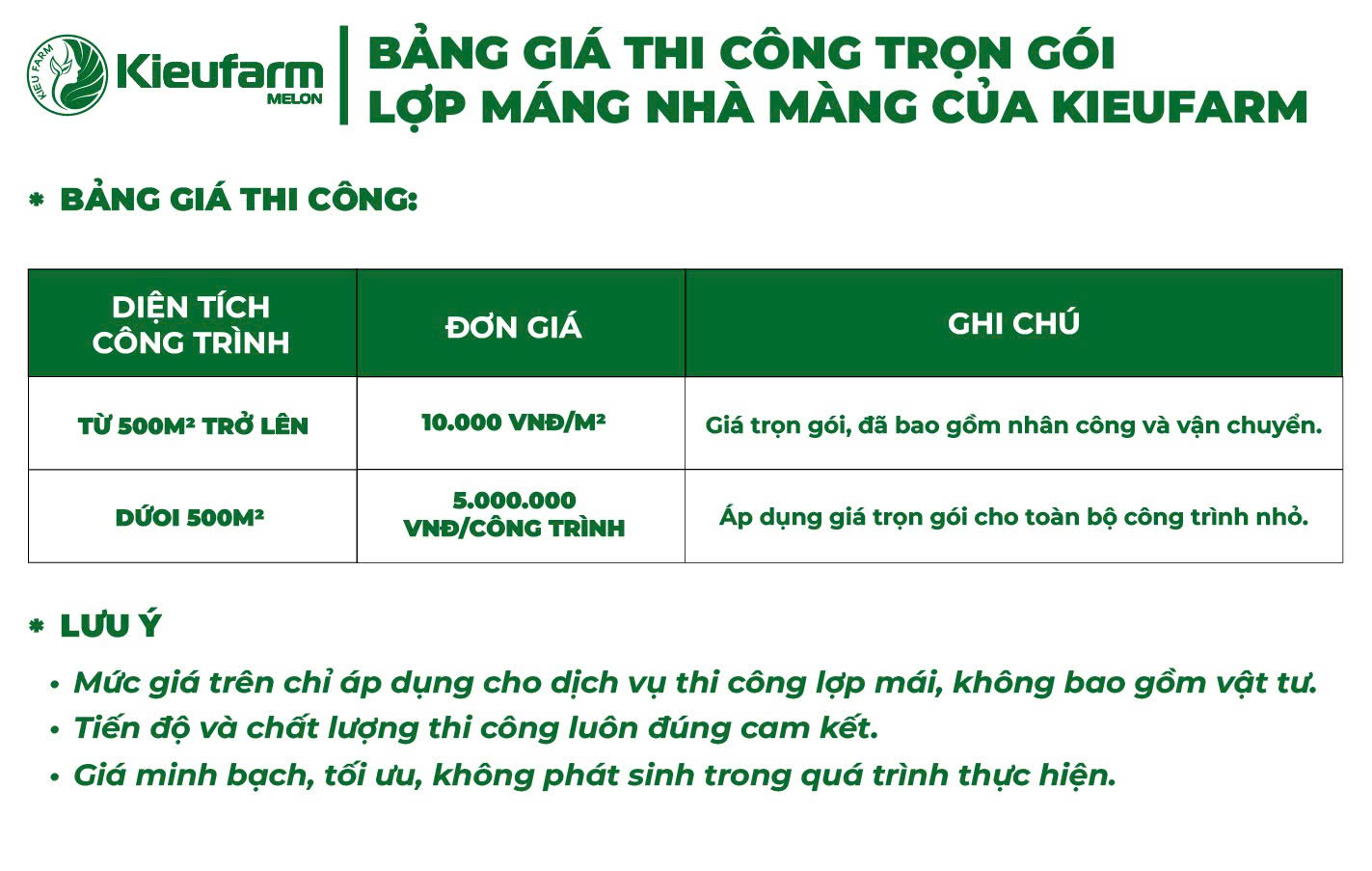 Mức giá trên áp dụng cho dịch vụ thi công lợp mái nhà kính (không bao gồm vật tư).
