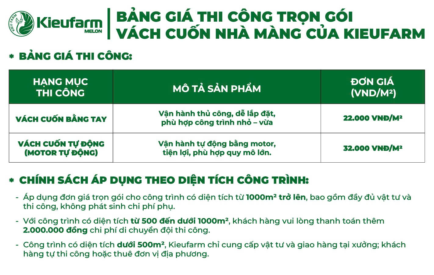 Dịch vụ thi công vách cuốn nhà màng của Kieufarm được báo giá theo hình thức trọn gói, đã bao gồm toàn bộ vật tư và chi phí thi công, không phát sinh thêm: