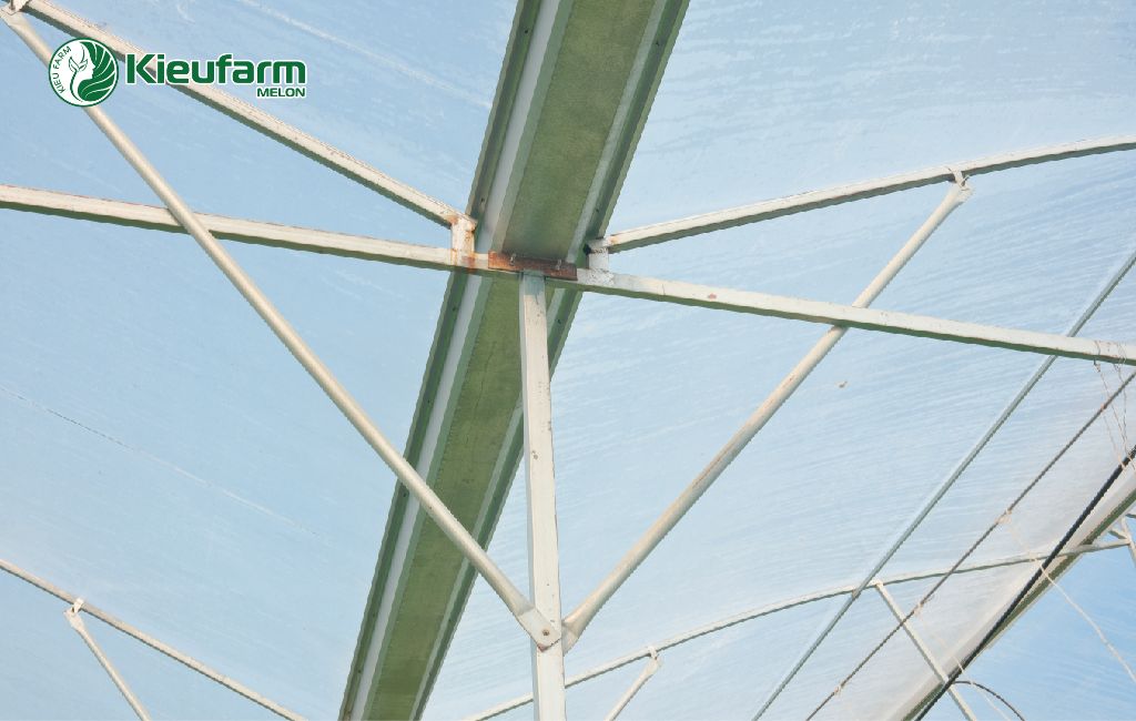 Nhà màng được xây dựng bằng khung thép mạ kẽm Z80 chịu lực, liên kết bằng bulong chống gỉ, kết cấu lắp ghép giúp dễ mở rộng hoặc bảo trì. Màng phủ SunMaster PE Clear 150 micron phủ 7 lớp, khuếch tán ánh sáng đều, chống tia UV, phù hợp cho khí hậu ven biển.