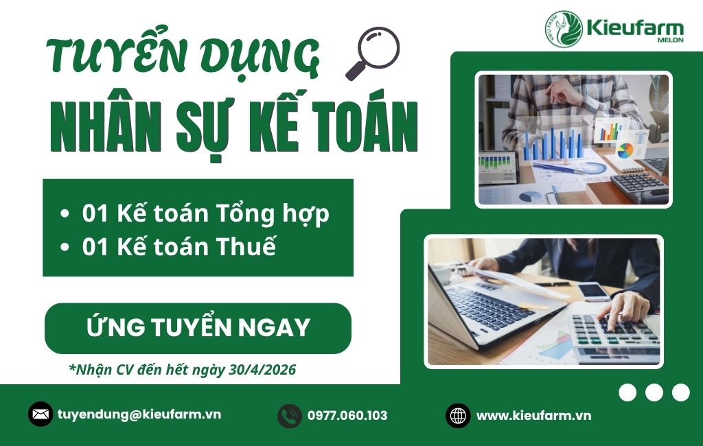 Kieufarm đang tìm kiếm những ứng viên kế toán có kinh nghiệm, chuyên môn vững vàng và tinh thần trách nhiệm cao để gia nhập đội ngũ. Đây là cơ hội dành cho những bạn mong muốn làm việc trong môi trường chuyên nghiệp, ổn định và có lộ trình phát triển rõ ràng trong lĩnh vực nông nghiệp công nghệ cao.