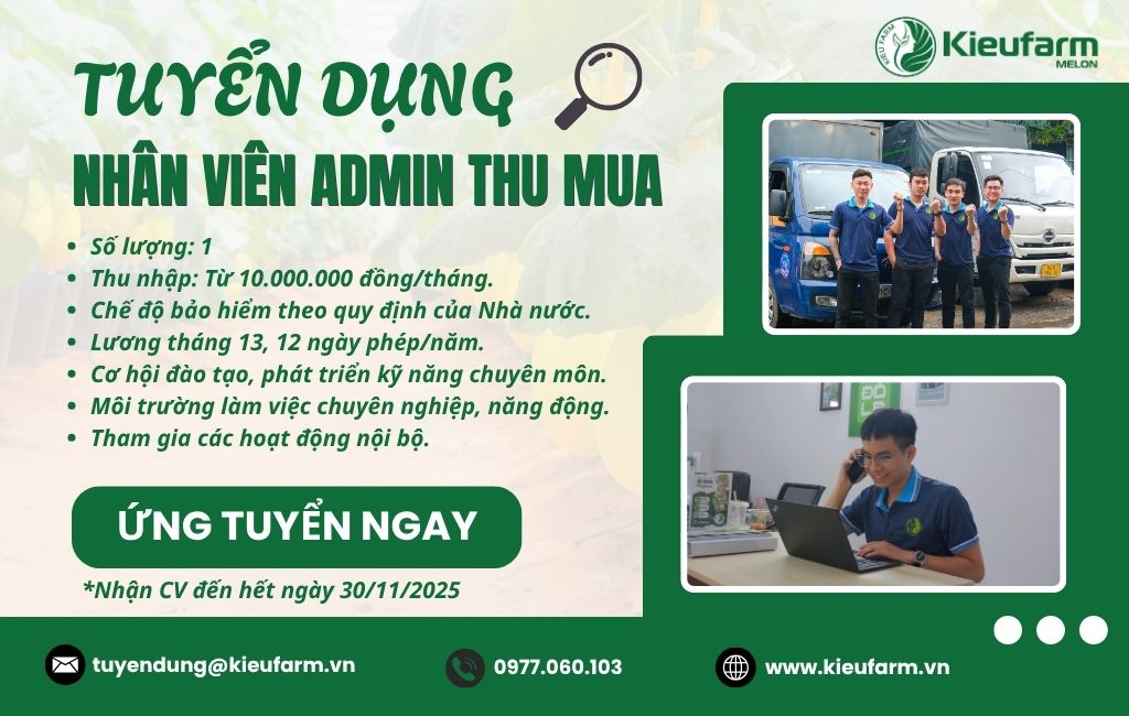 Kieufarm là đơn vị tiên phong trong phát triển hệ sinh thái dưa lưới công nghệ cao, bao gồm các mảng: nhà kính – giống cây trồng – vật tư nông nghiệp – đào tạo và tiêu thụ sản phẩm. Với mục tiêu mở rộng quy mô và tăng cường đội ngũ nhân sự tại chi nhánh, Kieufarm Chi nhánh Gia Lai hiện đang tìm kiếm Nhân viên Admin Thu mua để cùng đồng hành trong hành trình xây dựng chuỗi giá trị nông nghiệp bền vững.
