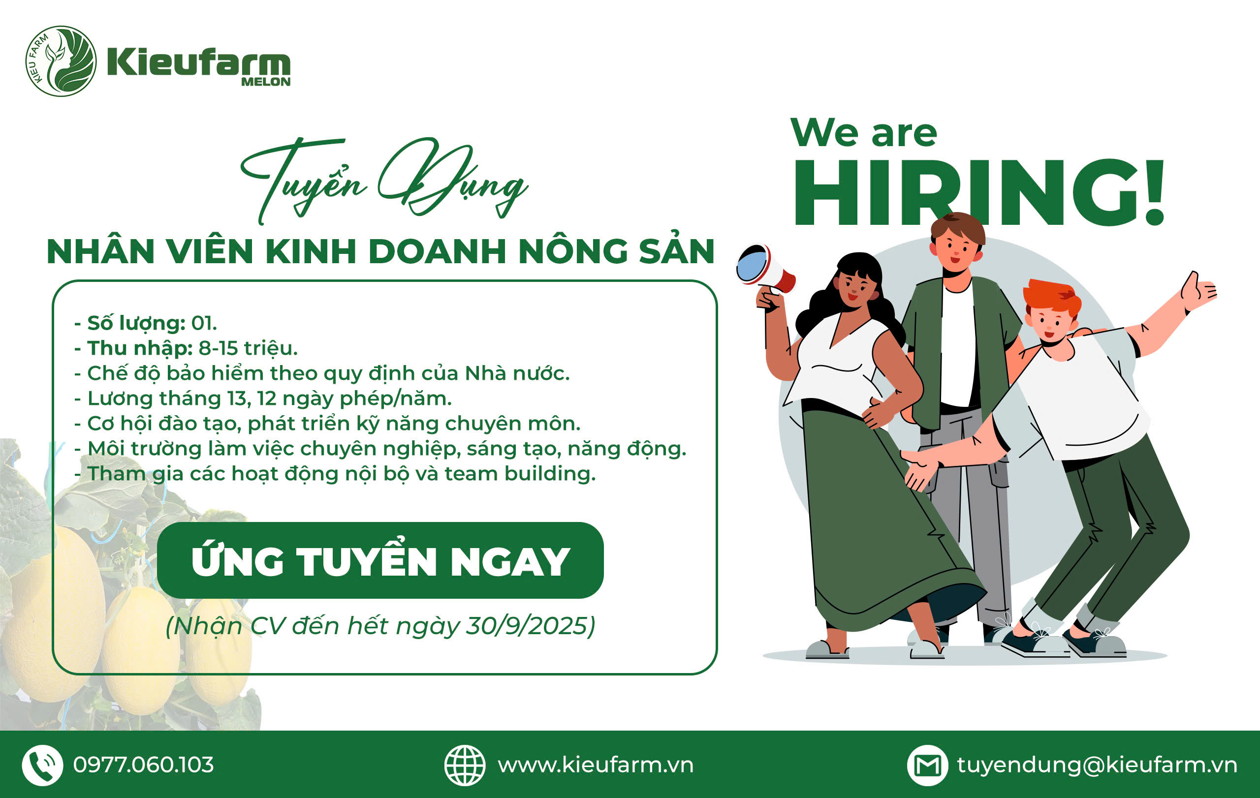 Ứng viên quan tâm vui lòng gửi CV về email tuyendung@kieufarm.vn với tiêu đề: Họ tên – Ứng tuyển nhân viên Kinh doanh Nông sản.