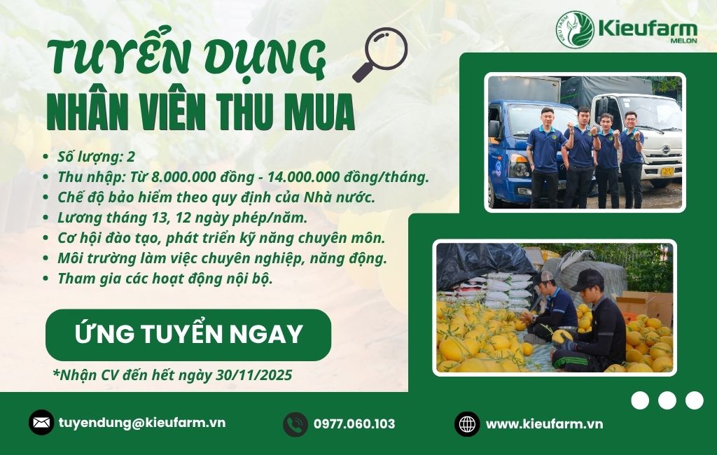 Bạn có đam mê với lĩnh vực nông nghiệp, đặc biệt là các mô hình trồng dưa lưới hiện đại? Bạn sở hữu kỹ năng đàm phán tốt, tư duy phân tích nhanh nhạy và mong muốn làm việc trong một môi trường năng động, thực tế và phát triển bền vững? Kieufarm đang tìm kiếm Nhân viên Thu mua để đảm nhiệm vai trò then chốt trong chuỗi cung ứng dưa lưới – sản phẩm chiến lược trong hệ sinh thái nông nghiệp của công ty.