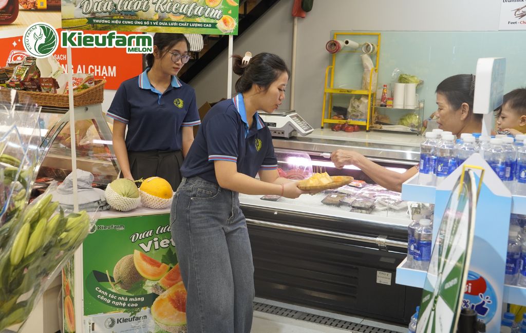 Bên cạnh các hoạt động kết nối và chia sẻ chuyên môn, năm 2025 cũng ghi dấu sự hiện diện của Kieufarm tại các cửa hàng và điểm bán thông qua chương trình sampling dưa lưới. Đây là cách Kieufarm lựa chọn để đồng hành trực tiếp cùng hệ thống phân phối, đưa sản phẩm tiếp cận người tiêu dùng một cách minh bạch và thực tế.