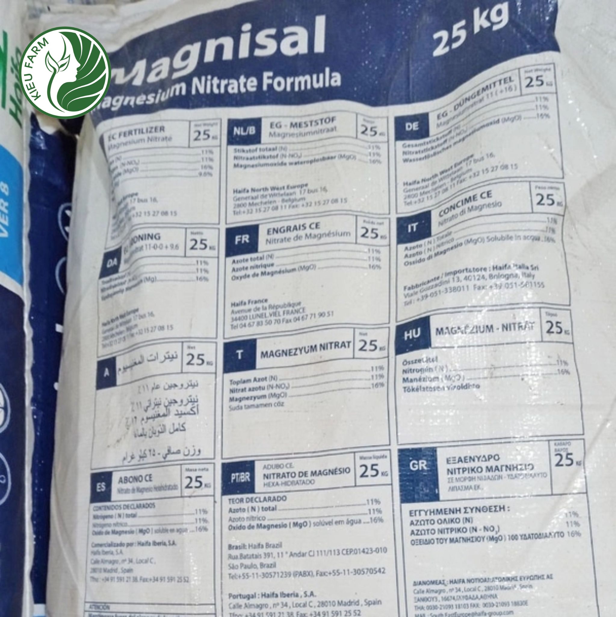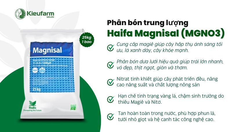 Phân bón Haifa Magnisal (MgNO₃) là phân bón trung lượng cao cấp do Kieufarm nhập khẩu và phân phối chính hãng, cung cấp đồng thời hai dưỡng chất thiết yếu cho dưa lưới là Magiê (Mg) và Nitrat (NO3).