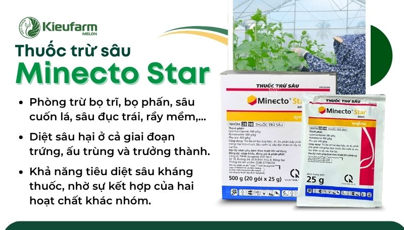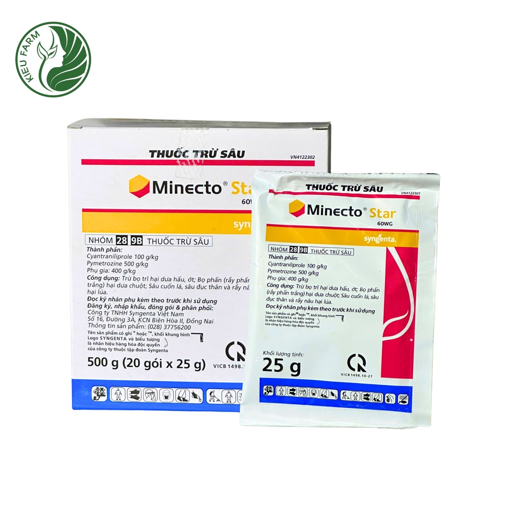 Thuốc trừ sâu Minecto là sản phẩm chất lượng cao đến từ tập đoàn Syngenta (Thụy Sĩ), thương hiệu uy tín hàng đầu trong lĩnh vực sản xuất các dòng thuốc bảo vệ thực vật. Với sự kết hợp hiệu quả hai hoạt chất mạnh Cyantraniliprole và Pymetrozine, thuốc trừ sâu Minecto Star 60WG giúp tiêu diệt nhiều loại sâu hại cứng đầu trên rau màu, cây ăn trái, dưa lưới và các dòng cây trồng khác,...giúp cây khỏe mạnh, năng suất cao và trái đẹp đồng đều.