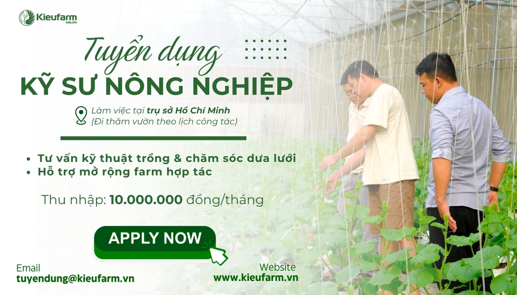 Kieufarm tuyển dụng Kỹ sư Nông nghiệp làm việc tại trụ sở Hồ Chí Minh (đi thăm vườn theo lịch công tác, có phương tiện di chuyển hỗ trợ). Với mức thu nhập lên đến 10 triệu/tháng, phúc lợi đầy đủ và cơ hội phát triển trong môi trường nông nghiệp công nghệ cao, đây là cơ hội dành cho những ứng viên yêu thích nông nghiệp công nghệ cao, muốn phát triển và gắn bó lâu dài.